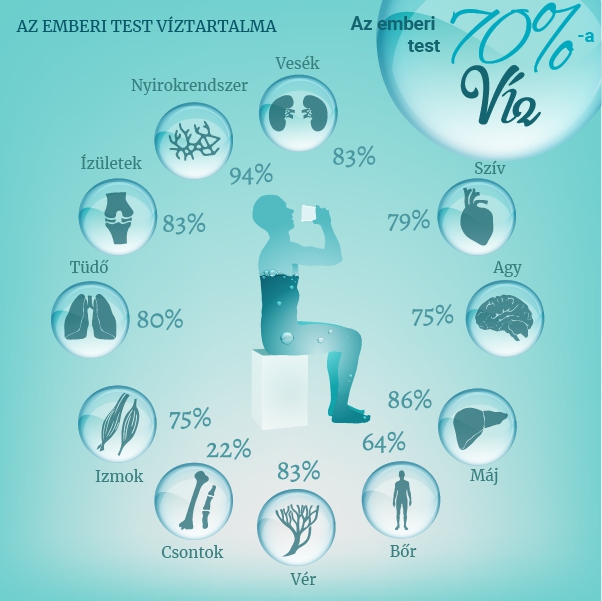 - Testünk közel 70%-a víz. Az alábbi ábrán láthatjuk, hogy belső szerveink víztartalma, illetve az ízületekben található vízmennyiség meghatározó, de még sontjaink egy részét is víz alkotja. Alapvetően testünk normál fizikai- és szellemi működésének mozgatórugója a víz.